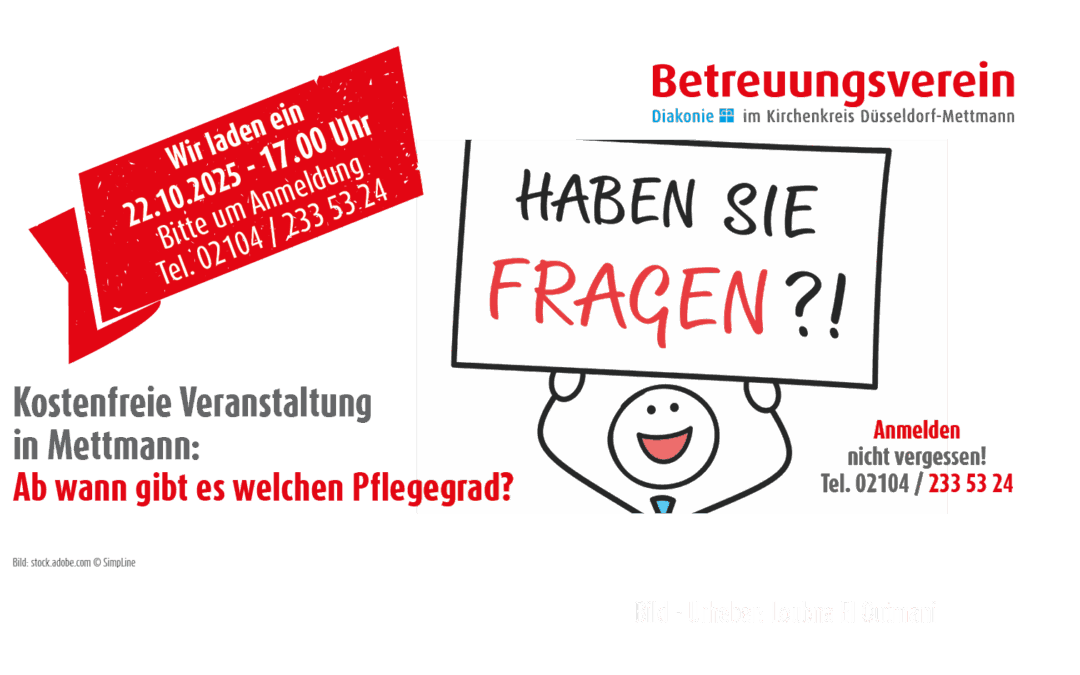 Die Veranstaltung findet am Mittwoch, den 22. Oktober 2025 um 17:00 Uhr im Haus der Diakonie, Bismarckstraße 39 in Mettmann statt.